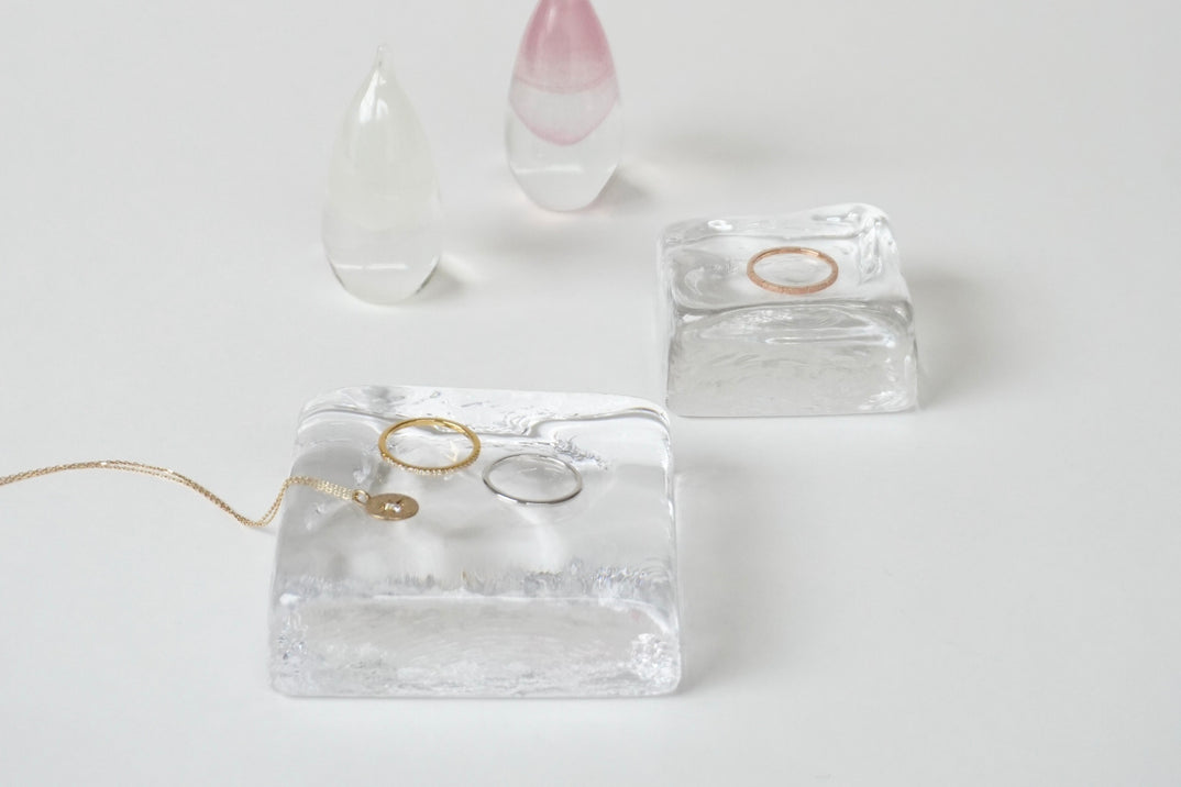 シンプルながらも、透明感あるクリアガラスと表情豊かな凹凸が、ジュエリーの輝きを引き立てます。