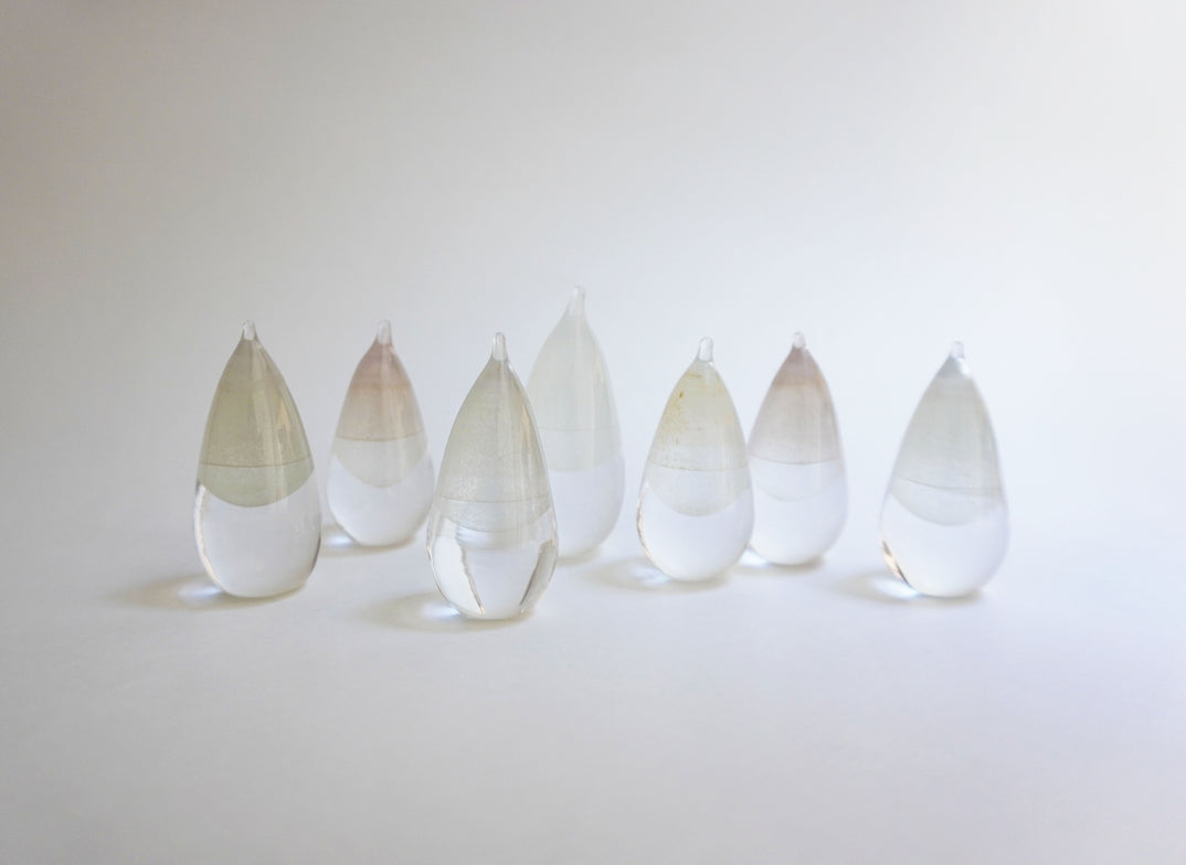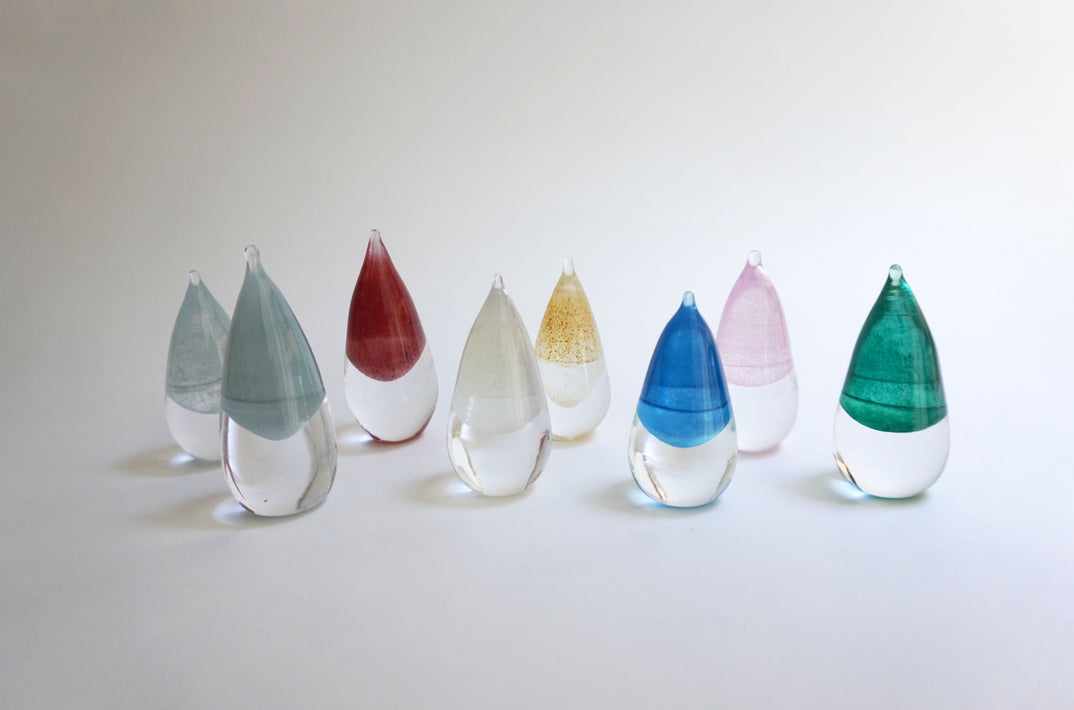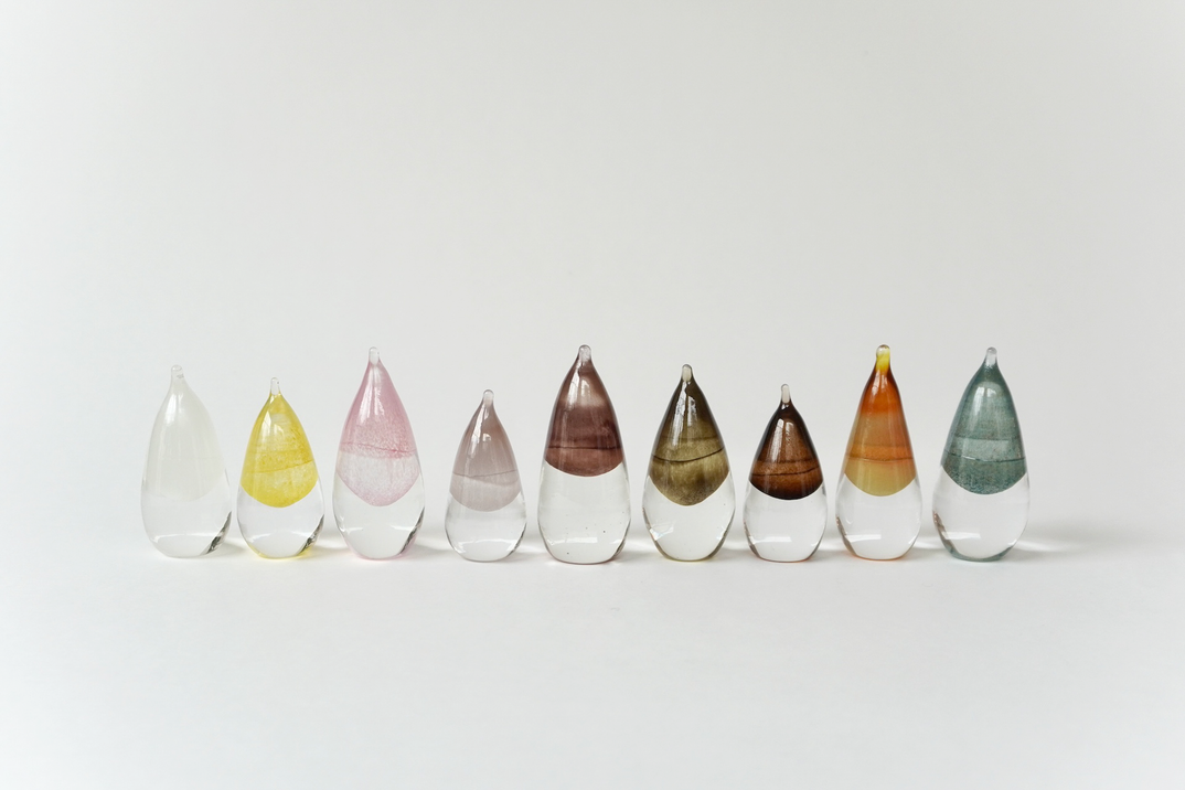 主にパウダー状の色ガラスの重なりで多様な表情や色を表現した製品が特徴的です。吹きガラスにより生まれる揺らぎを個性として活かし、表現するガラスはひとつひとつ手作業のため、器や花器・オブジェなどの同じ商品でも色や形に個体差があります。