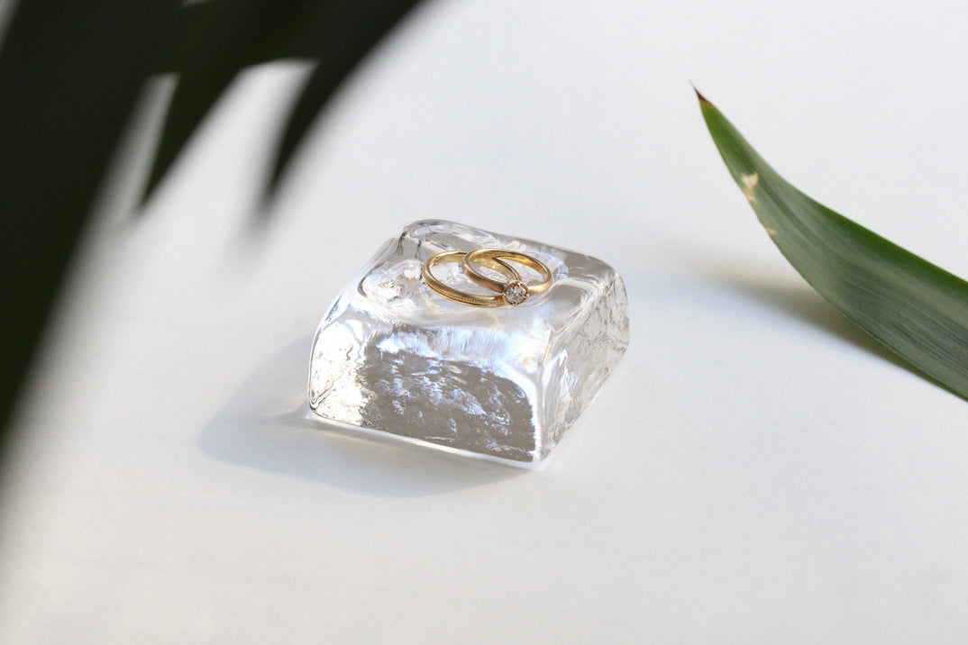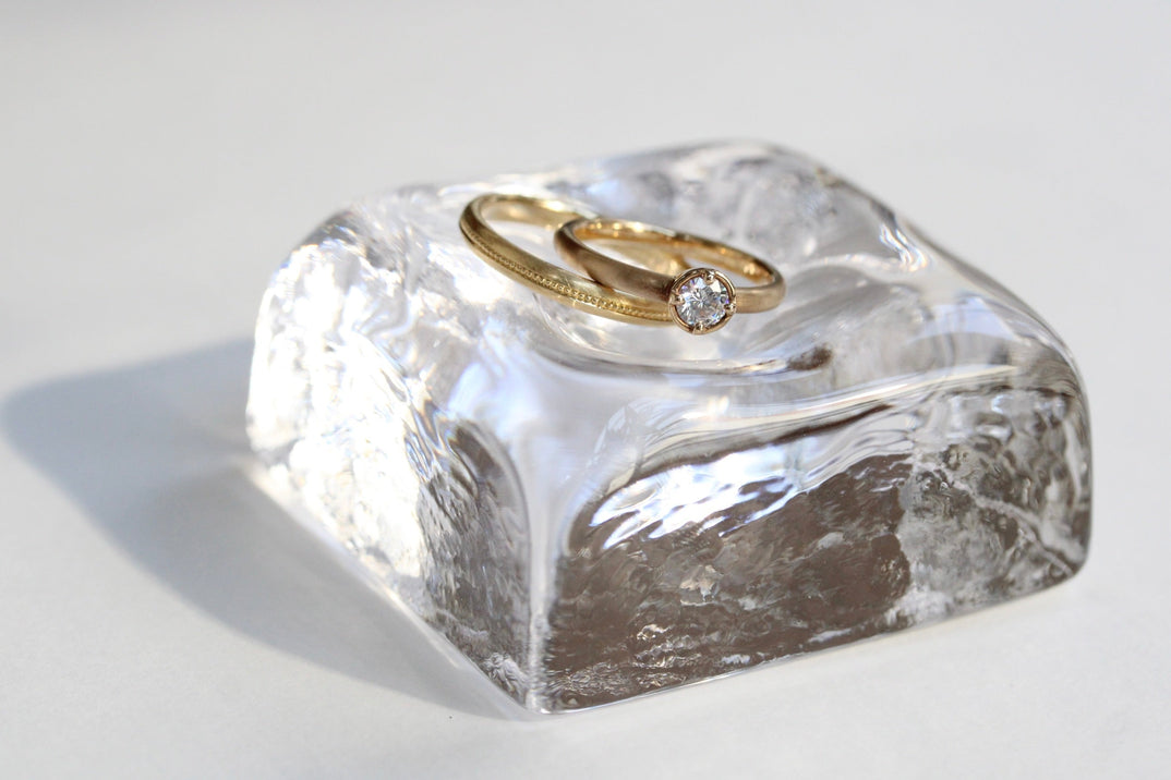 リングが2つ収まるような凹凸は、ひとつひとつ手作業でつけられています。それによって生まれた揺らぎは、光を受けてさまざまに輝きます。光の差し込む角度によって、見るたびに異なる表情をお楽しみいただけます。